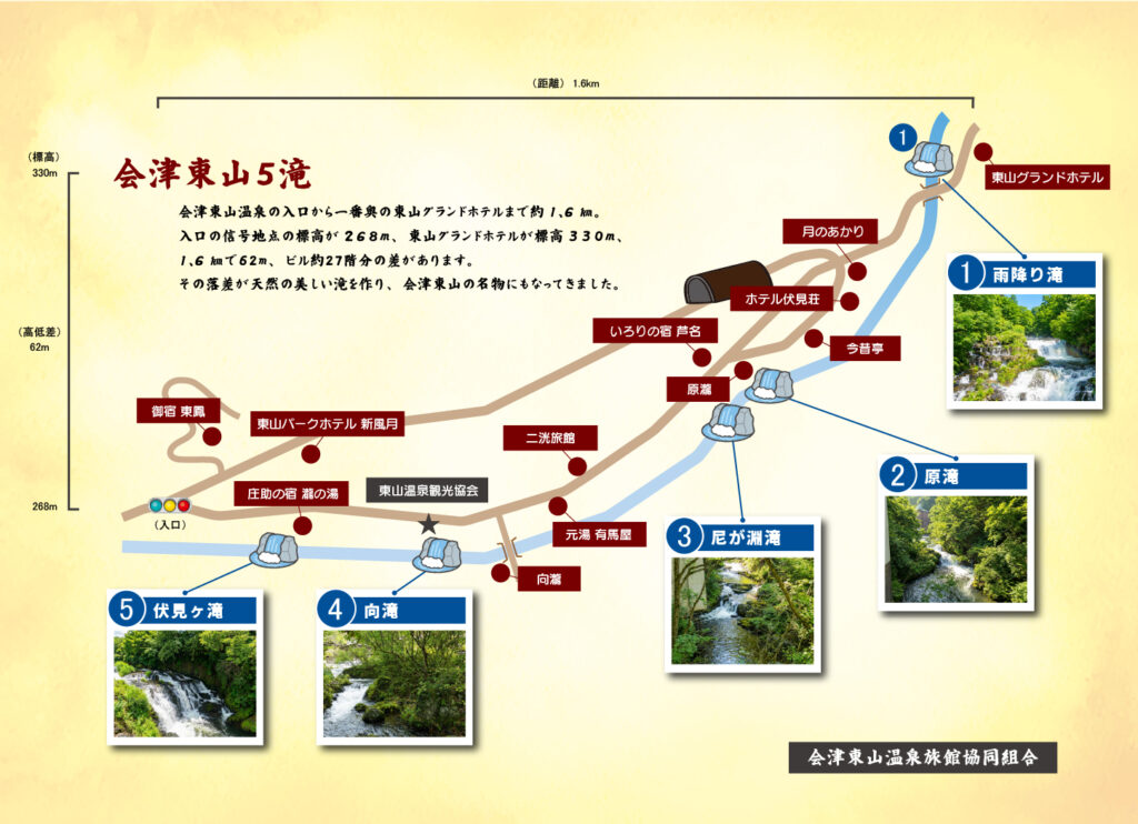 会津東山5滝 「会津東山5滝」とは 会津東山温泉の入口から一番奥の東山グランドホテルまで約1.6㎞。 入口の信号地点の標高が268m、東山グランドホテルが標高330m、1.6㎞で62m、ビル約27階分の差があります。 その落差が天然の美しい滝を作り、会津東山の名物にもなってきました。