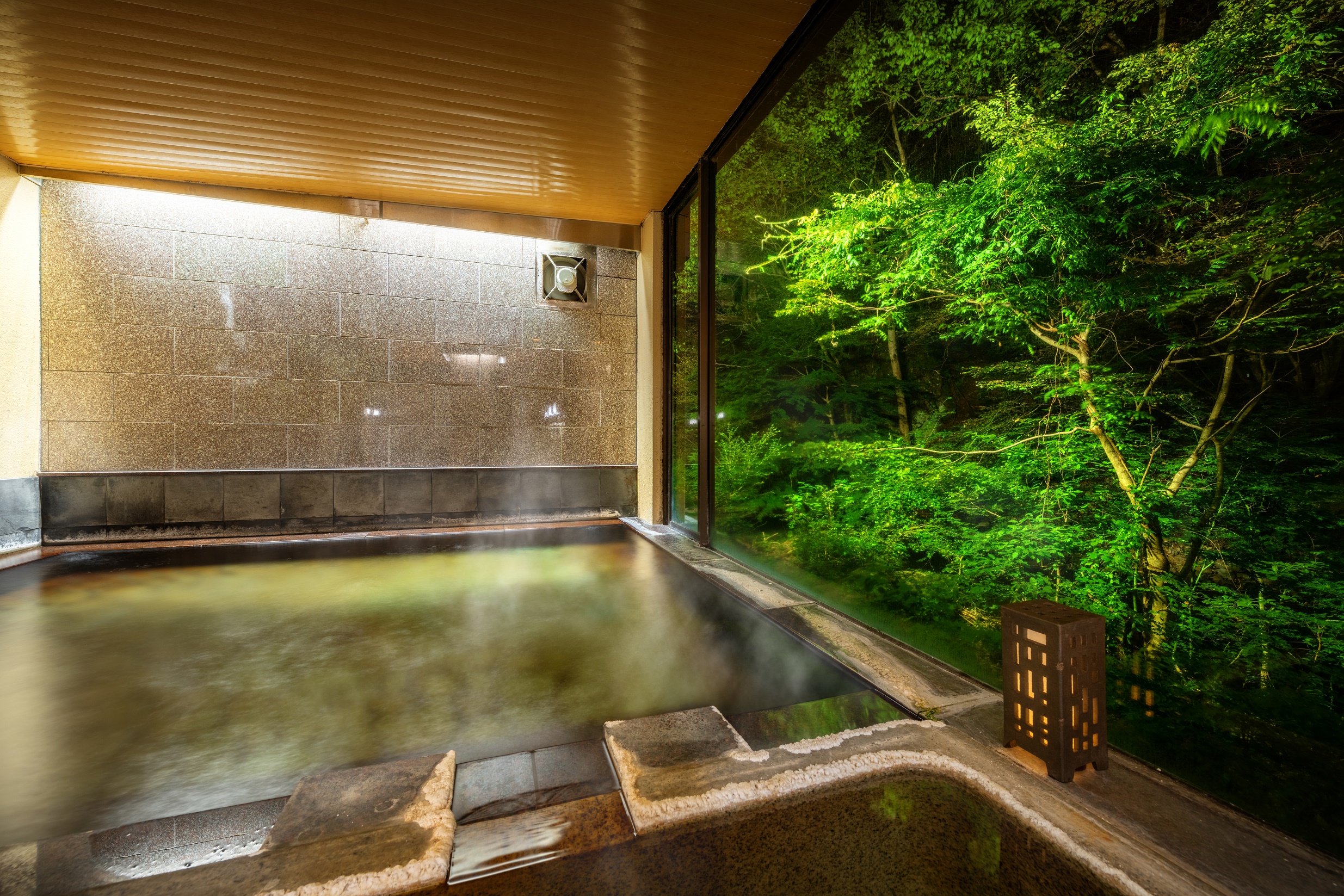 湯川の渓谷美が窓に広がる内湯。