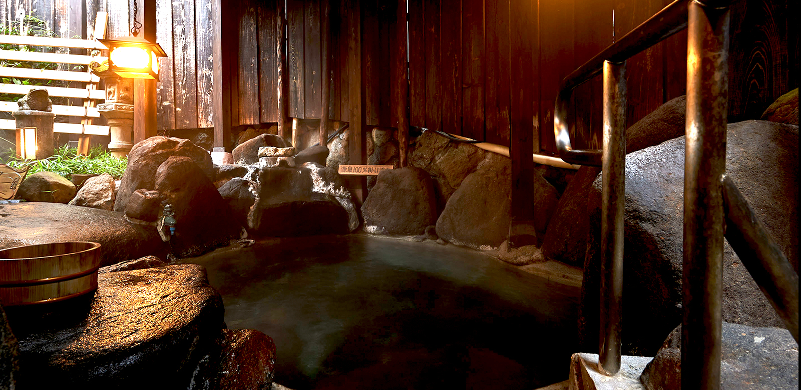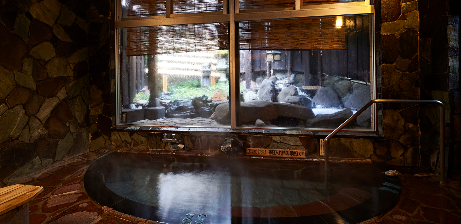 粋な半月の型をした内湯、大胆な岩の配置が男性的な露天風呂があります。少し熱めの源泉かけ流しの湯に、足を伸ばして入ってほしいです。時間帯貸切も。