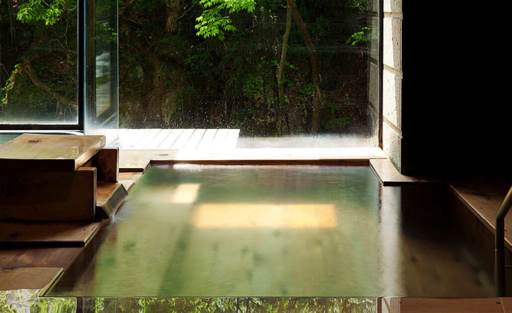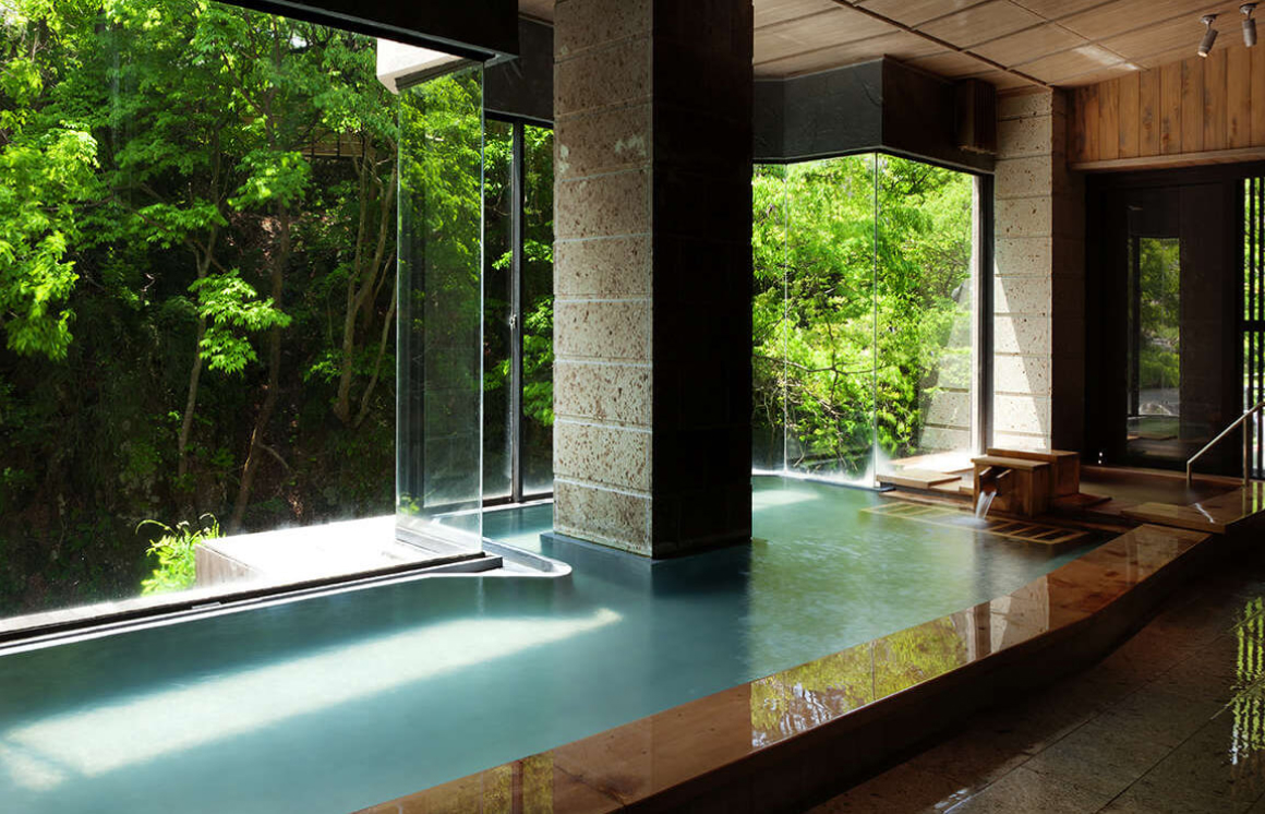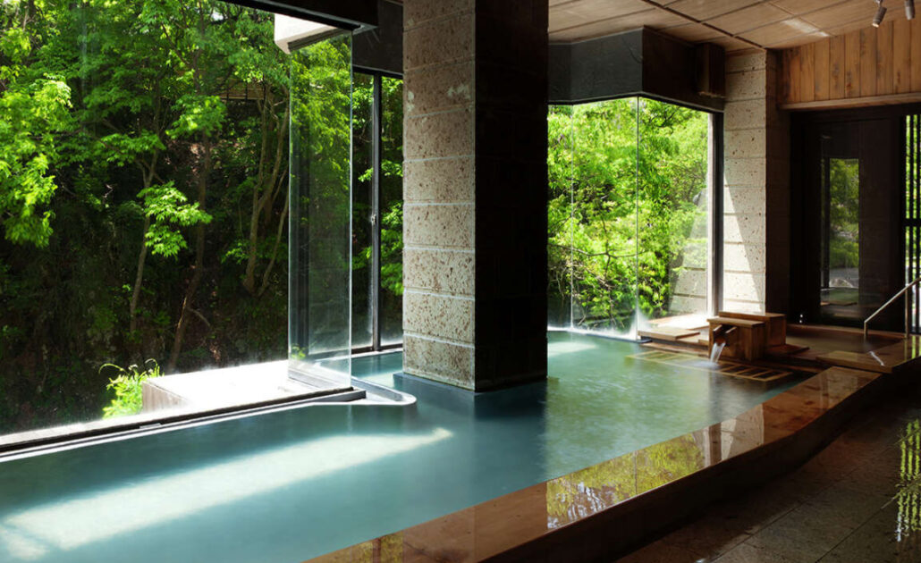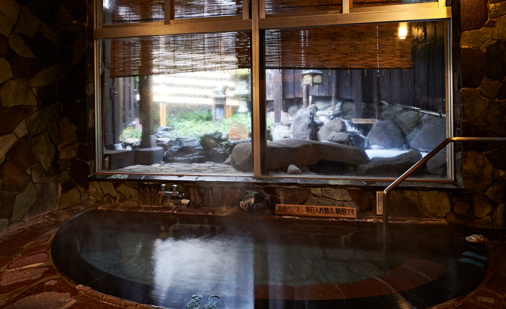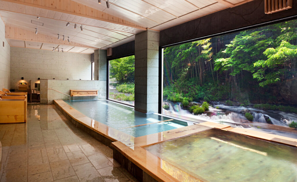 大きな窓から伏見ヶ滝の流れを望む大浴場。壁は大谷石、床には松島石、湯縁に青森ヒバを使い、浴場にヒバの良い香りに包まれて温泉を満喫できます。