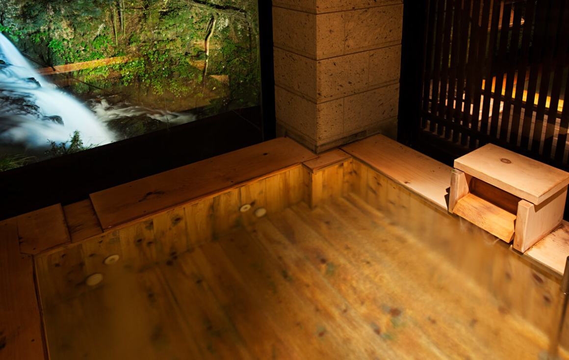 伏見滝が真横に流れる絶景。国産の高級檜を全面に使用。微細な泡を噴射させるシルキーバスも設置してあり、景色もお風呂も時間を忘れるほどの魅力があります。