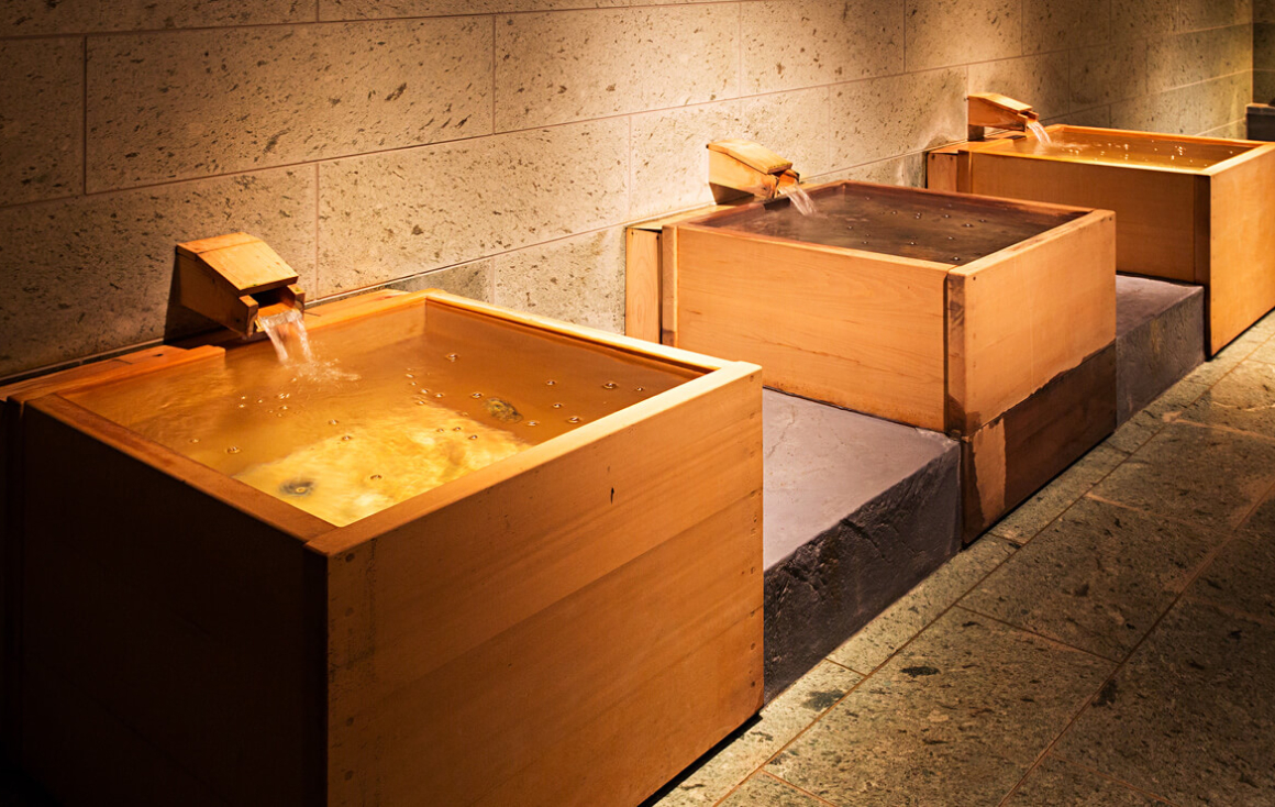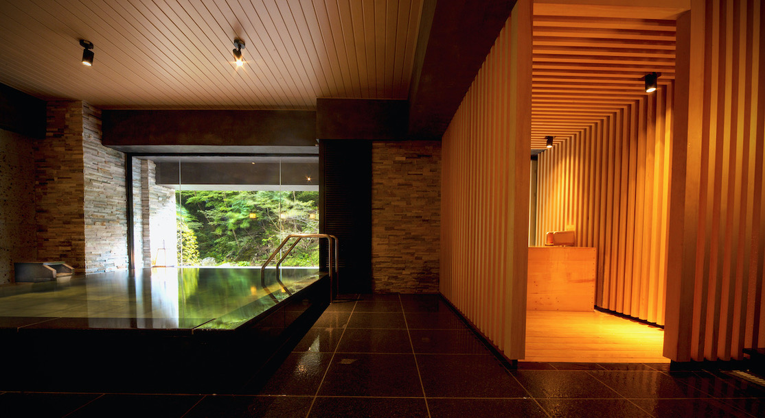 瀧の湯にある7つの貸切風呂の一つ。建築家による「木のぬくもり」と「天然石の質感」にこだわった浴槽です。ソファースペースもあるお洒落な空間です。