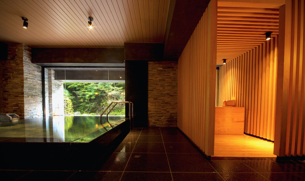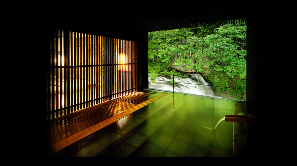 伏見ヶ滝の上に位置する大浴場。大きな窓から湯川をめで、壁に十和田石、床に松島石、湯縁に国産檜を贅沢に配した特別な空間です。