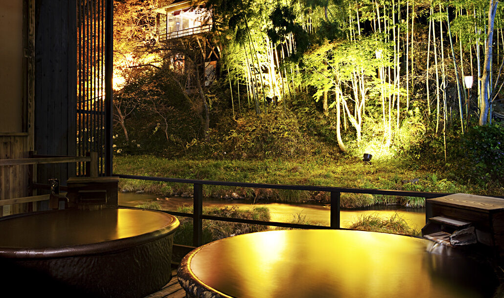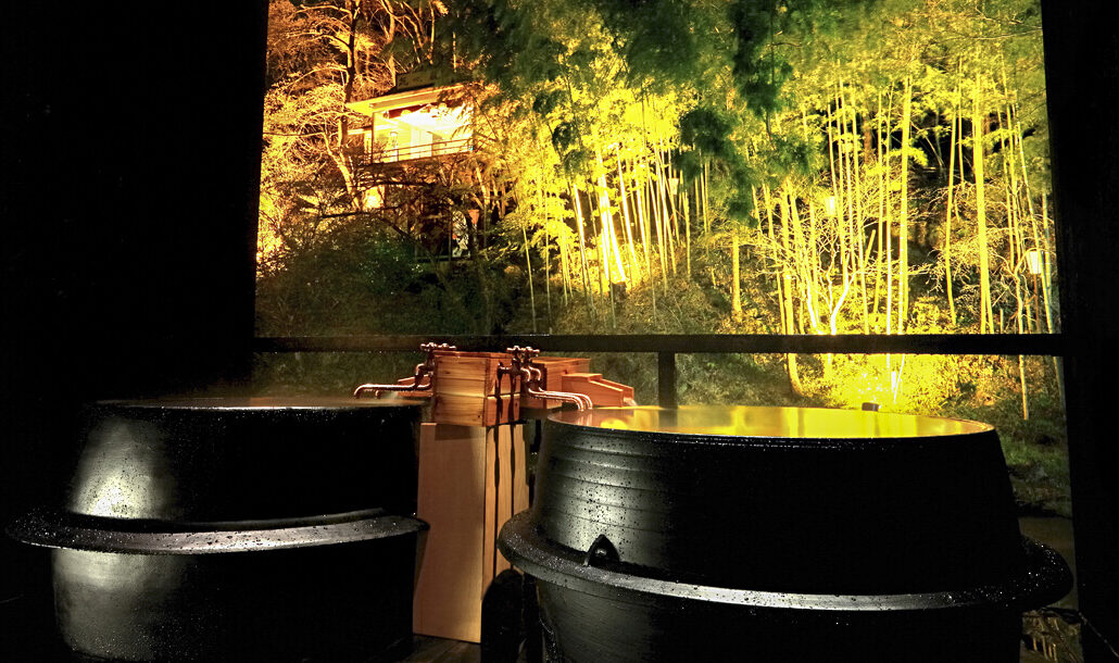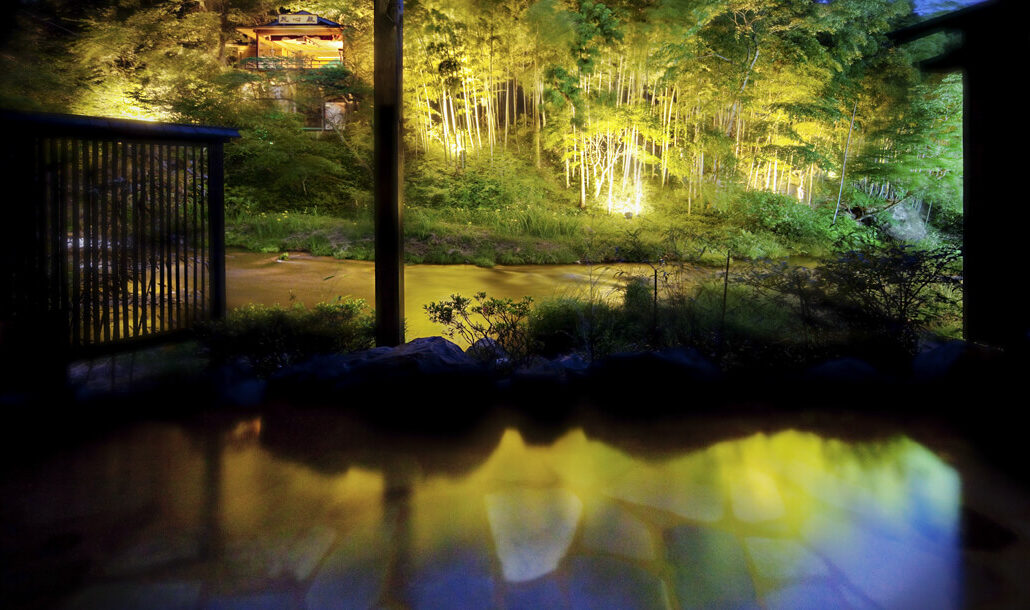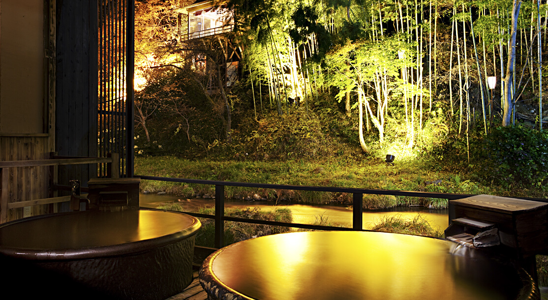 瀧の湯にある7つの貸切風呂の一つ。川面に近い目線で、渓流と竹林、そして「能舞台 花心殿」を独り占めできます。浴槽は特注の信楽焼で、高め・ぬるめの温度を変えてご用意しています。