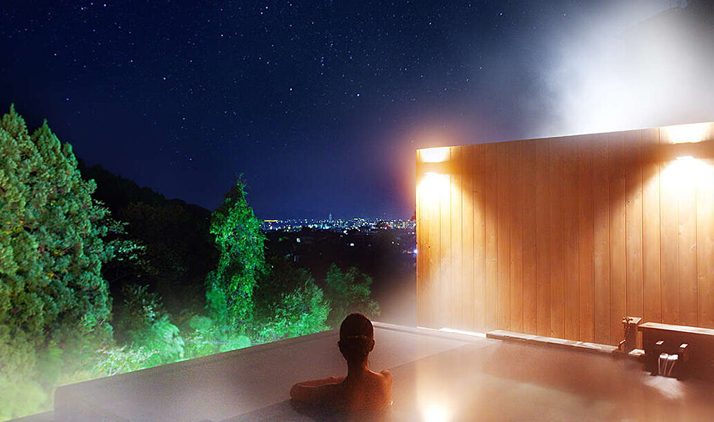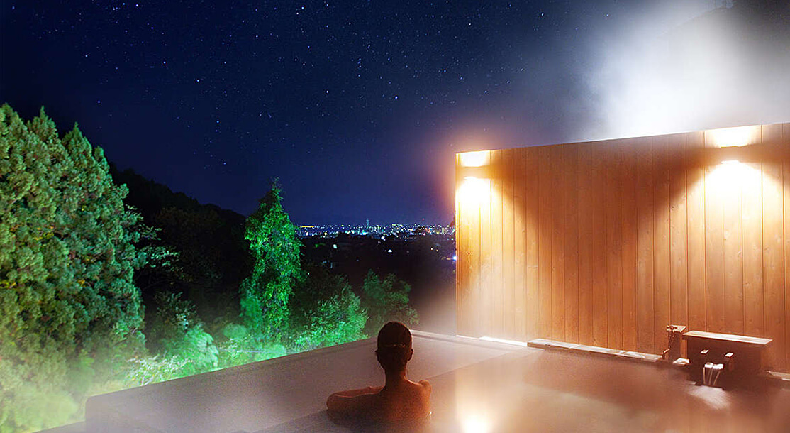 瀧の湯にある7つの貸切風呂の一つ。城下町まで3㎞ほど、光源が少ない立地のため町の夜景もキレイです。更に空気が澄んだ日は満天の星、時には流れ星も見られるほどの異空間です。